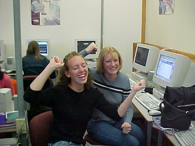 Here are the two Jessicas being silly and acting like they are cheering, but they don't know that they are not at a game, but in computer class. They are so crazy! |